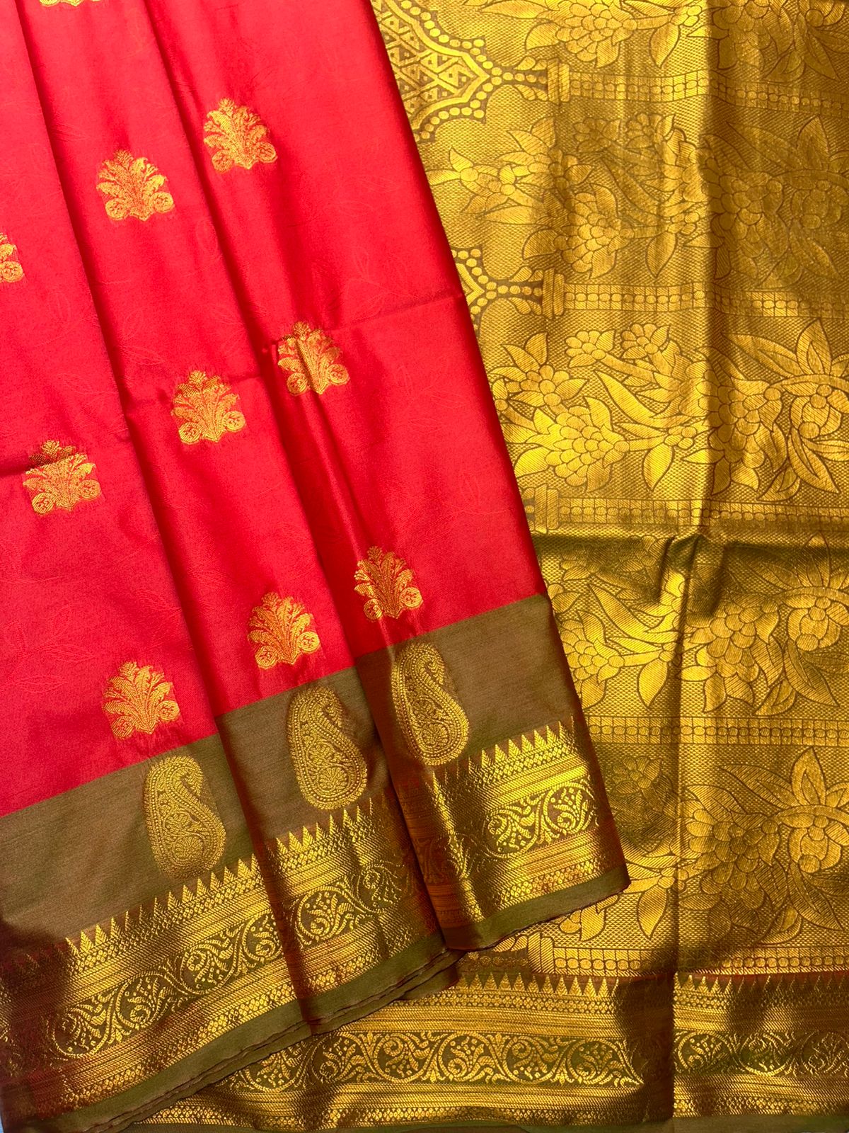 • Pallu: Brown (#8B4513) with all-over gold zari paisley and ornamental patterns
