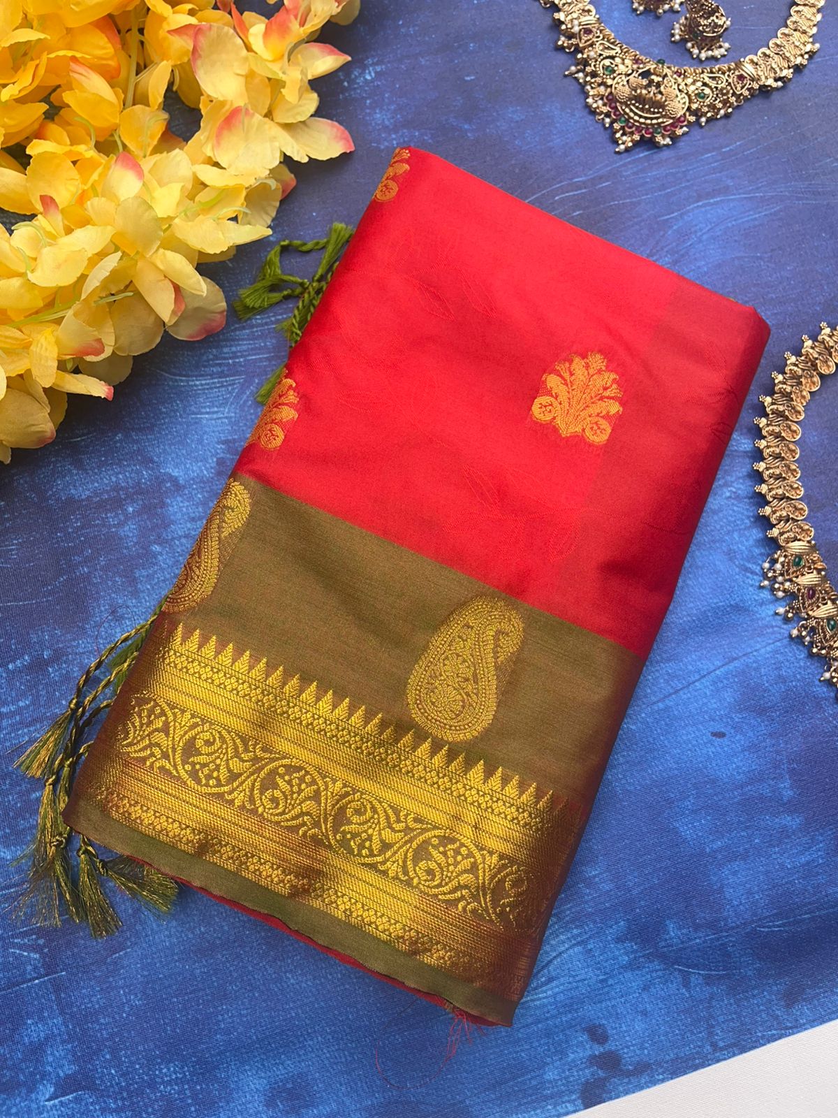 • Body: Bright Red (#FF4500) with gold zari peacock and fan motifs