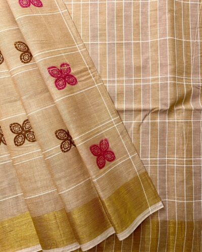 Premium Budget Friendly Pure Cotton Saree featuring a stunning Beige cream body adorned with white grid check pattern and hand-printed pink and brown floral motifs. The matching Beige pallu showcases elegant golden yellow accent stripes with the same traditional check weave, creating a perfect balance between understated elegance and rich ornamentation. Ideal for office wear, regular daily use, and casual occasions, this timeless piece combines traditional South Indian craftsmanship with modern comfort and affordability.