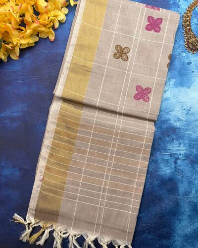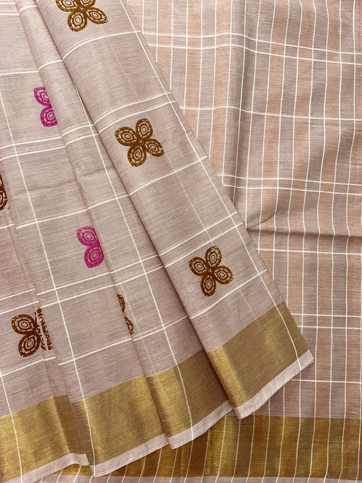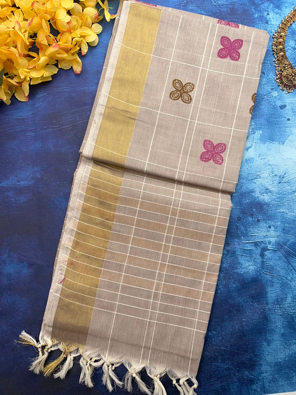 Premium Budget Friendly Pure Cotton Saree featuring a stunning Beige body adorned with white grid check pattern and hand-printed brown and magenta floral motifs. The matching Beige pallu showcases the same traditional check weave with brown and magenta hand-printed designs, transitioning to olive and golden yellow at the bottom, creating a perfect balance between understated elegance and rich ornamentation. Ideal for office wear, regular daily use, and casual occasions, this timeless piece combines traditional South Indian craftsmanship with modern comfort and affordability.