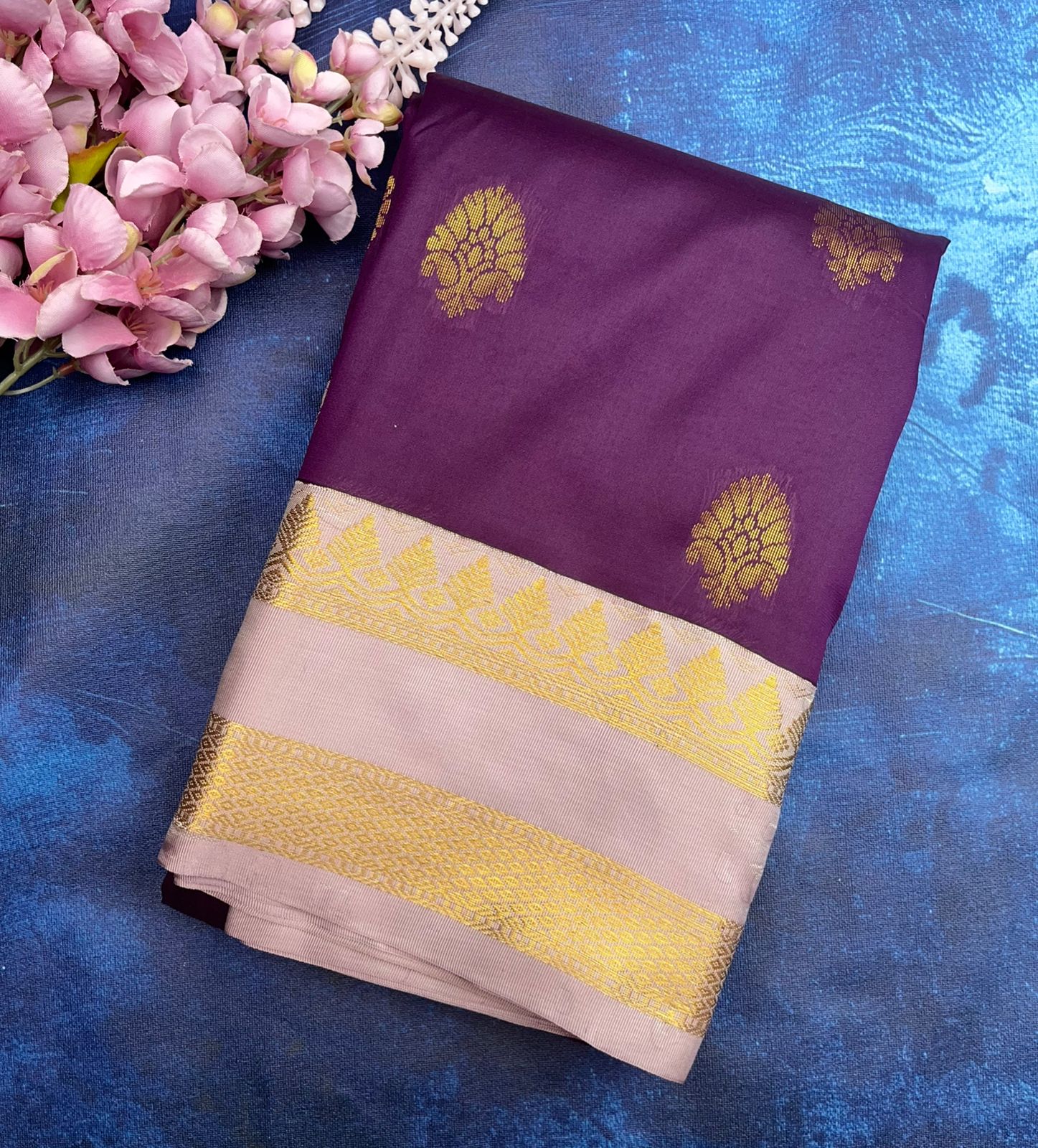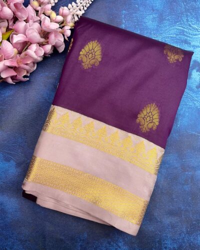 Premium Art Silk Saree featuring a stunning deep purple body adorned with small gold zari fan and shell motifs (peacock-like fan pattern) scattered throughout. The elaborate pale cream/beige pallu showcases dense gold zari brocade detailing with intricate geometric diamond and lattice patterns, creating a perfect balance between traditional temple wear elegance and rich ornamentation. The cream/beige border features ornate multi-layered gold zari diamond and leaf motif design. Ideal for festive gatherings, temple functions, and special occasions, this timeless piece combines authentic South Indian craftsmanship with contemporary sophistication.