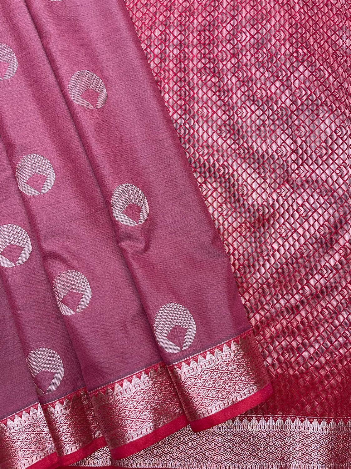 Premium Luxury Semi Soft Silk Saree featuring a stunning Bright Pink body adorned with white and cream circular heart-shaped mesh motifs with hatching patterns. The elaborate Deep Red pallu showcases an all-over diamond lattice jaal weave in white and cream, while the white, cream, pink and red metallic geometric band with triangular chevron temple tooth and diamond lattice pattern adds refined detailing. Ideal for festive gatherings, celebrations, and special occasions, this timeless piece combines traditional South Indian craftsmanship with contemporary sophistication.