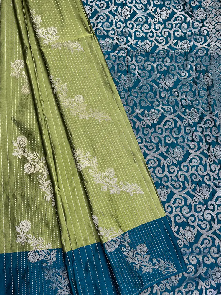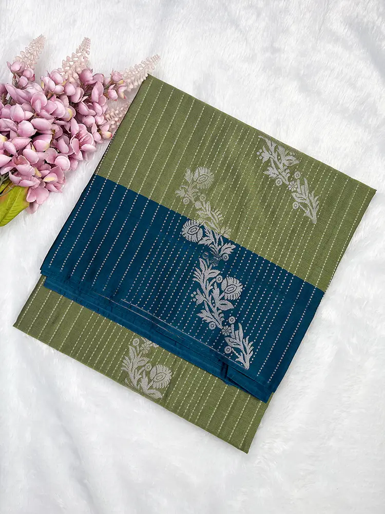 Vaira Oosi pattern soft silk saree, woven with exquisite craftsmanship and finished with rich silver zari detailing. The saree features a refreshing light olive green body highlighted with delicate vertical vaira oosi stripes and floral motifs. Its stunning deep aqua blue contrast border and pallu add a regal touch, enriched further with intricate silver zari designs.