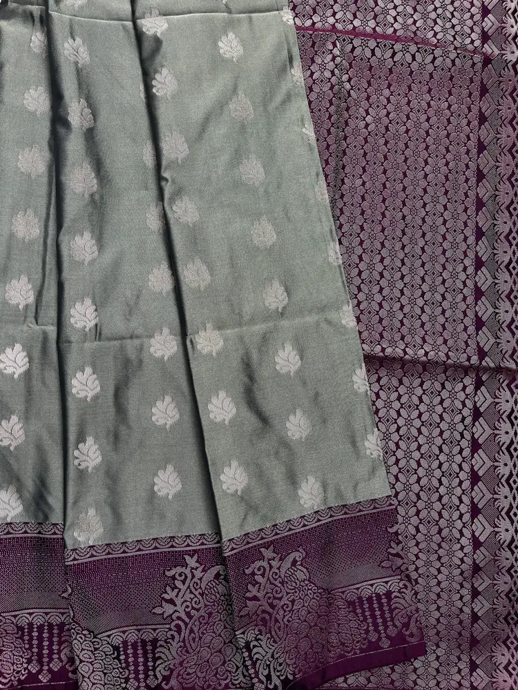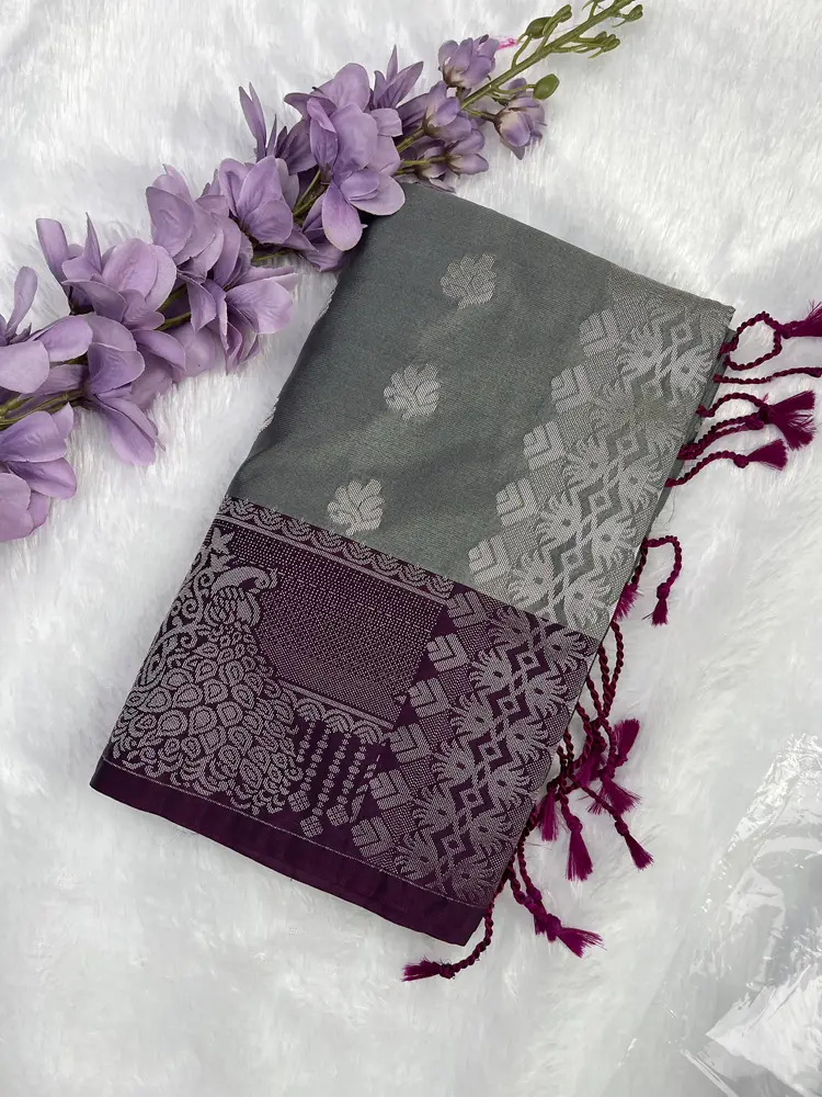 Experience refined elegance with this Luxury Soft Silk Saree, crafted with serene pastel tones and exquisite zari workmanship. The saree features a calming pastel grey body, enriched with delicate silver zari leaf motifs that add a soft, graceful sheen.