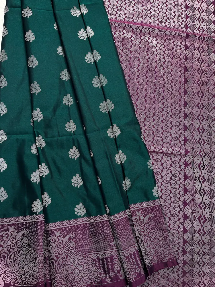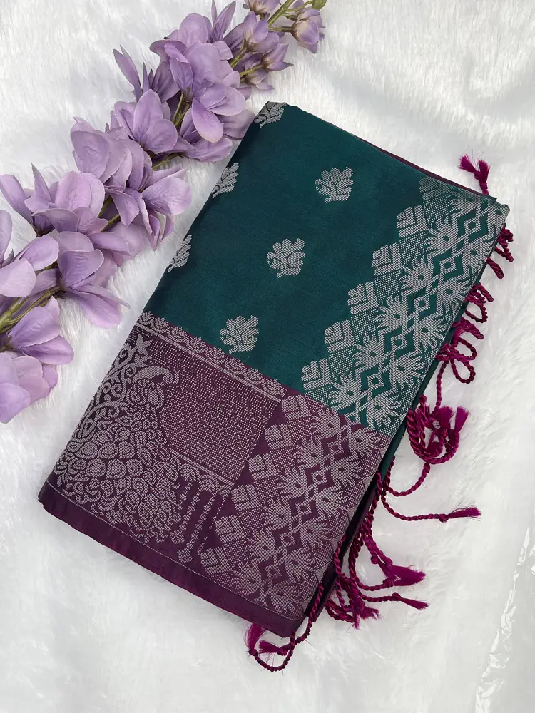 Step into refined elegance with this Luxury Soft Silk Saree, exquisitely crafted for those who adore rich colours and traditional grandeur. The saree features a stunning teal green body, beautifully decorated with silver zari leaf buttas that add a luxurious shimmer and sophisticated appeal.