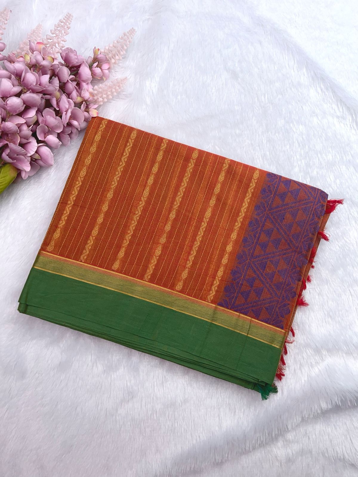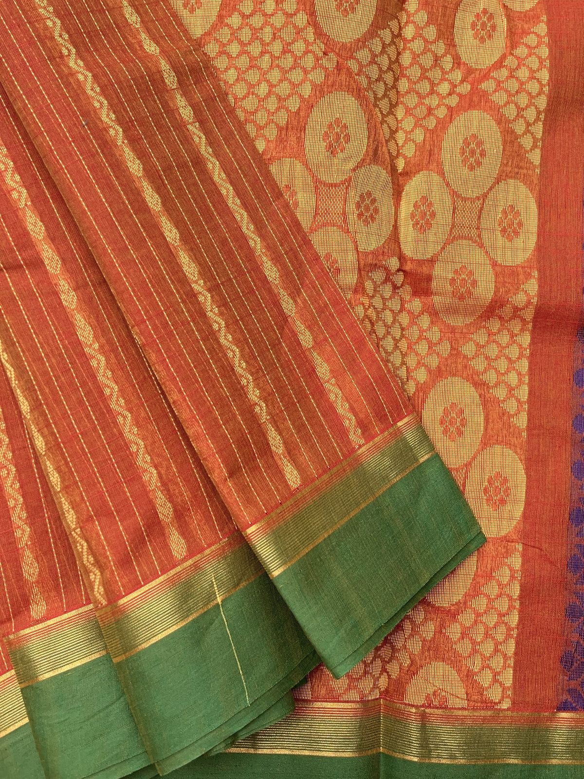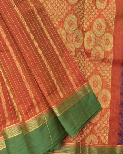 Elegant Pure Cotton Vaira Oosi Pattern saree featuring a warm burnt orange body adorned with elegant vertical golden thread stripes interlaced with delicate vine and creeper motifs, creating a sophisticated yet understated textured appearance. The exquisite pallu is the showpiece, adorned with grand circular medallion motifs filled with intricate floral latticework in golden thread, transitioning into a striking indigo-blue geometric temple triangle pattern at the terminal edge, creating a dramatic color contrast. The generous bottle green contrast border with fine golden accent lines runs along the length, providing bold classic color contrast and traditional South Indian heritage grounding. Red and green hand-tied tassels at the pallu end add authentic handloom finishing. Ideal for temple visits, festive gatherings, and traditional celebrations, this timeless piece embodies quintessential South Indian handloom craftsmanship with auspicious colour harmony.
