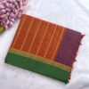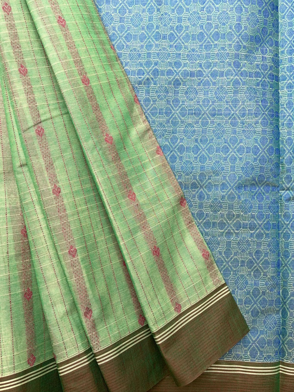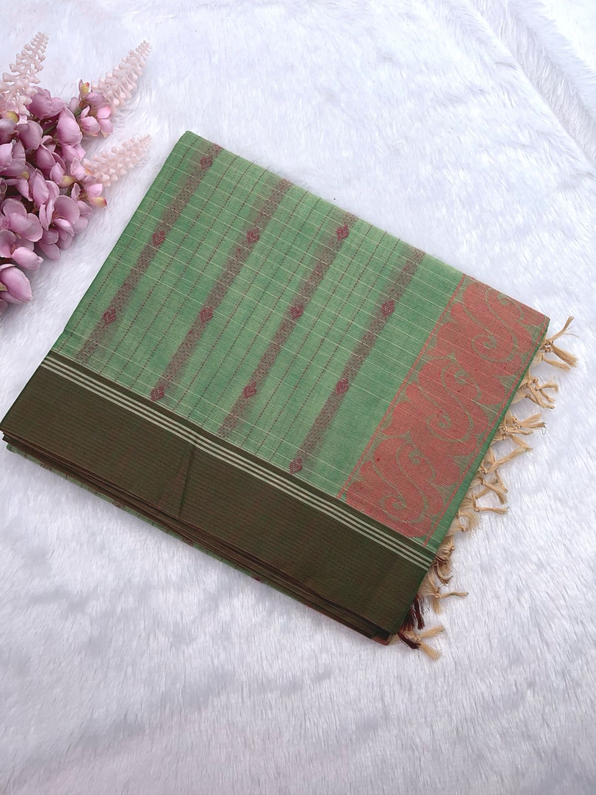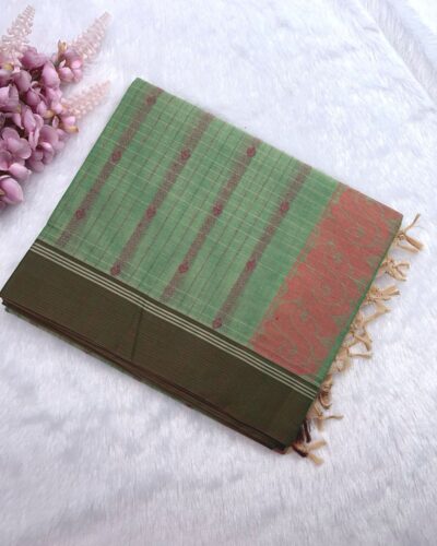 Elegant Pure Cotton Vaira Oosi Pattern saree featuring a soft mint green body adorned with fine horizontal maroon pin stripes and scattered diamond-shaped maroon buttas creating rhythmic visual texture without overwhelming the fabric. The exquisite terracotta coral pallu showcases traditional woven paisley and scrollwork motifs with graceful vine patterns, creating a beautiful warm-cool color interplay against the fresh mint green body. The dark olive green border with cream pin-stripe accents provides strong grounding contrast, complemented by cream hand-tied tassels at the pallu end adding an artisanal handloom finishing touch. Ideal for daily wear, office settings, temple visits, and casual gatherings, this timeless piece combines traditional South Indian handloom craftsmanship with graceful understated elegance.