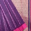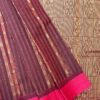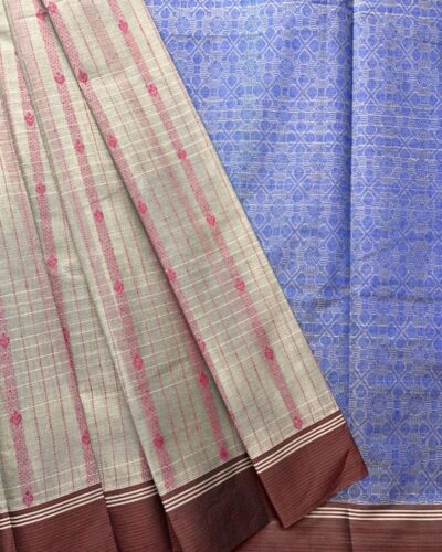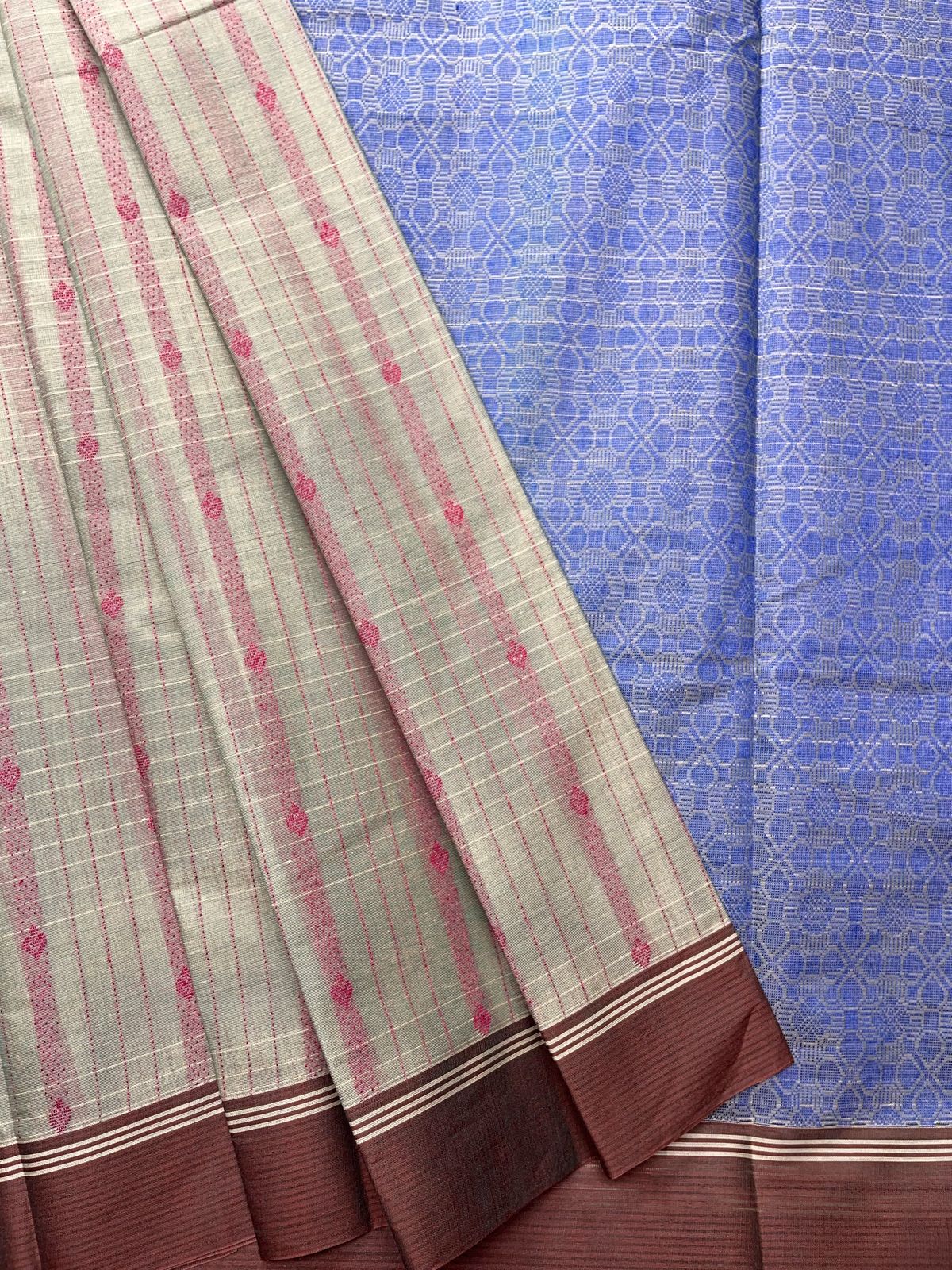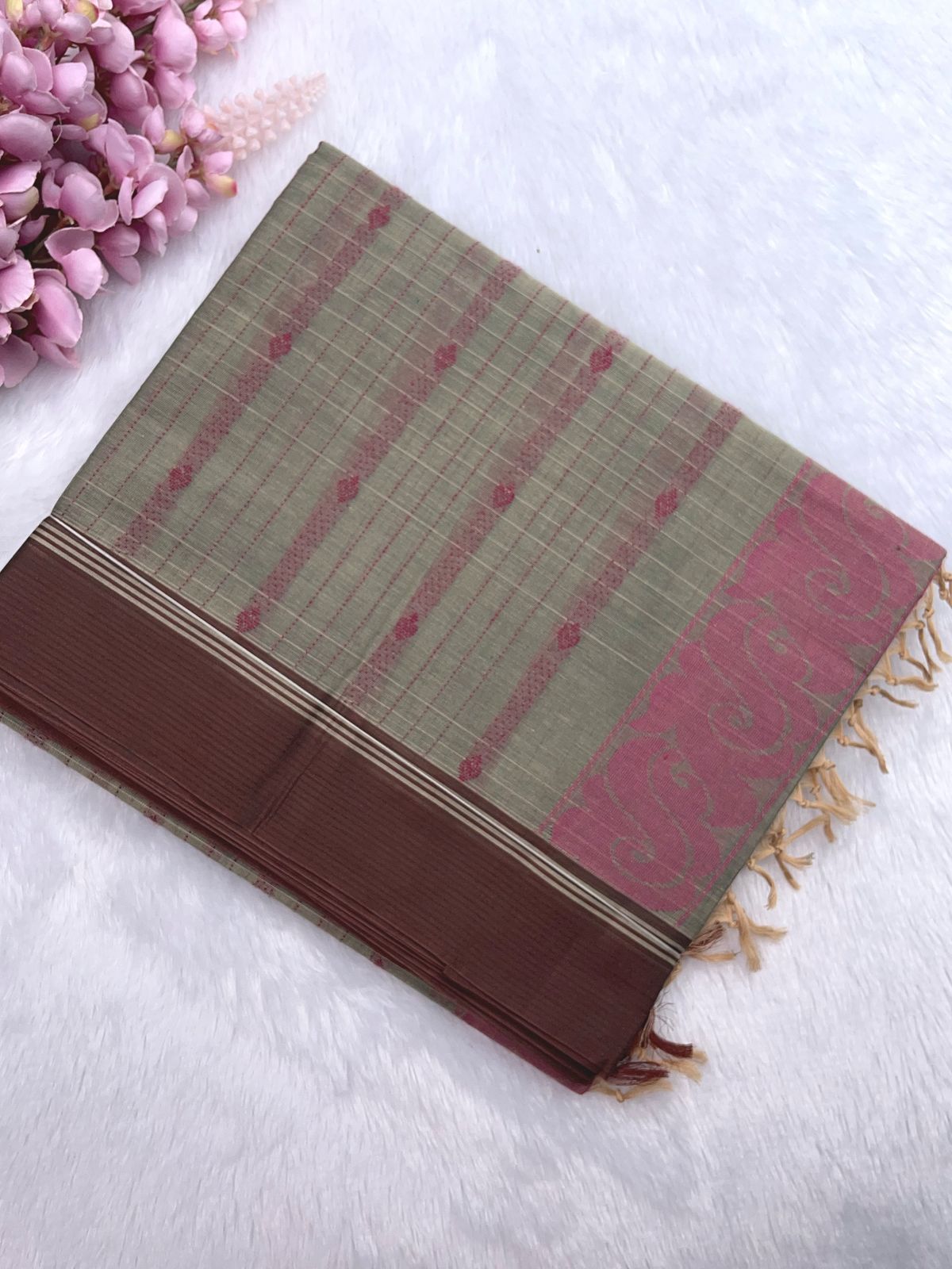 Elegant Pure Cotton Vaira Oosi Pattern saree featuring a soft sage green body adorned with fine maroon vertical stripes and scattered pink woven teardrop and bud motifs creating a delicate all-over textured appearance. The exquisite cornflower blue pallu showcases an intricate geometric jacquard pattern with interlocking hexagons, diamonds, and lattice grid work in white and silver, complemented by a secondary dusty rose pallu endpiece featuring scrolling floral and paisley motifs. The sophisticated dark maroon border with cream pin-stripes anchors the composition beautifully. Ideal for semi-formal occasions, daily elegant wear, and traditional gatherings, this timeless piece combines traditional South Indian handloom craftsmanship with contemporary muted sophistication.