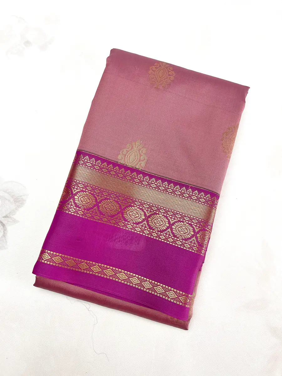 This elegant Luxury Semi Kanchipuram Saree features a delicate baby-pink body, embellished with graceful gold zari buttas and subtle woven detailing that gives the saree a soft, feminine, and festive appeal.