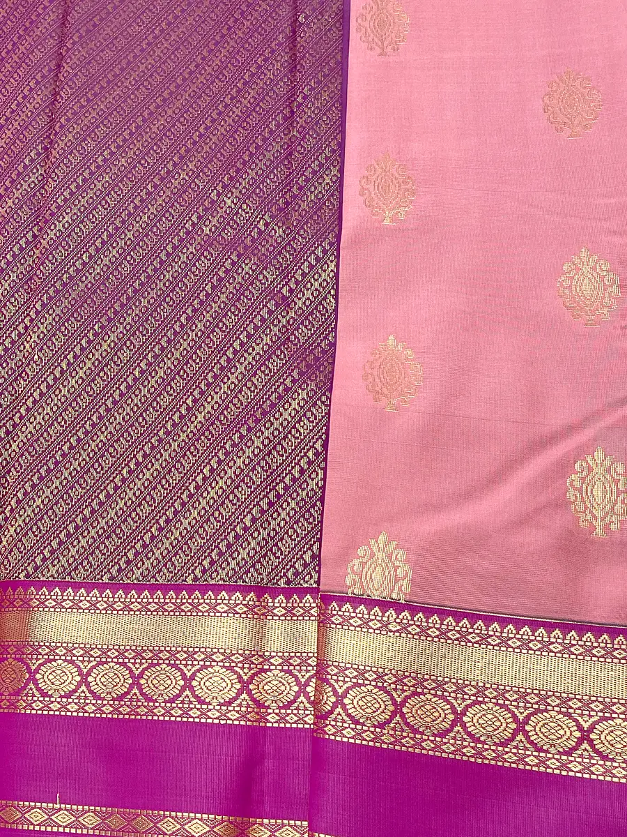 The rich purple pallu brings depth and grandeur with its intricate diagonal zari patterns, creating a bold contrast against the pastel body. The authentic rani-pink Korvai border, crafted using the traditional korvai interlocking technique, is adorned with luxurious gold annam and floral motifs—perfectly balancing vibrance and heritage richness.