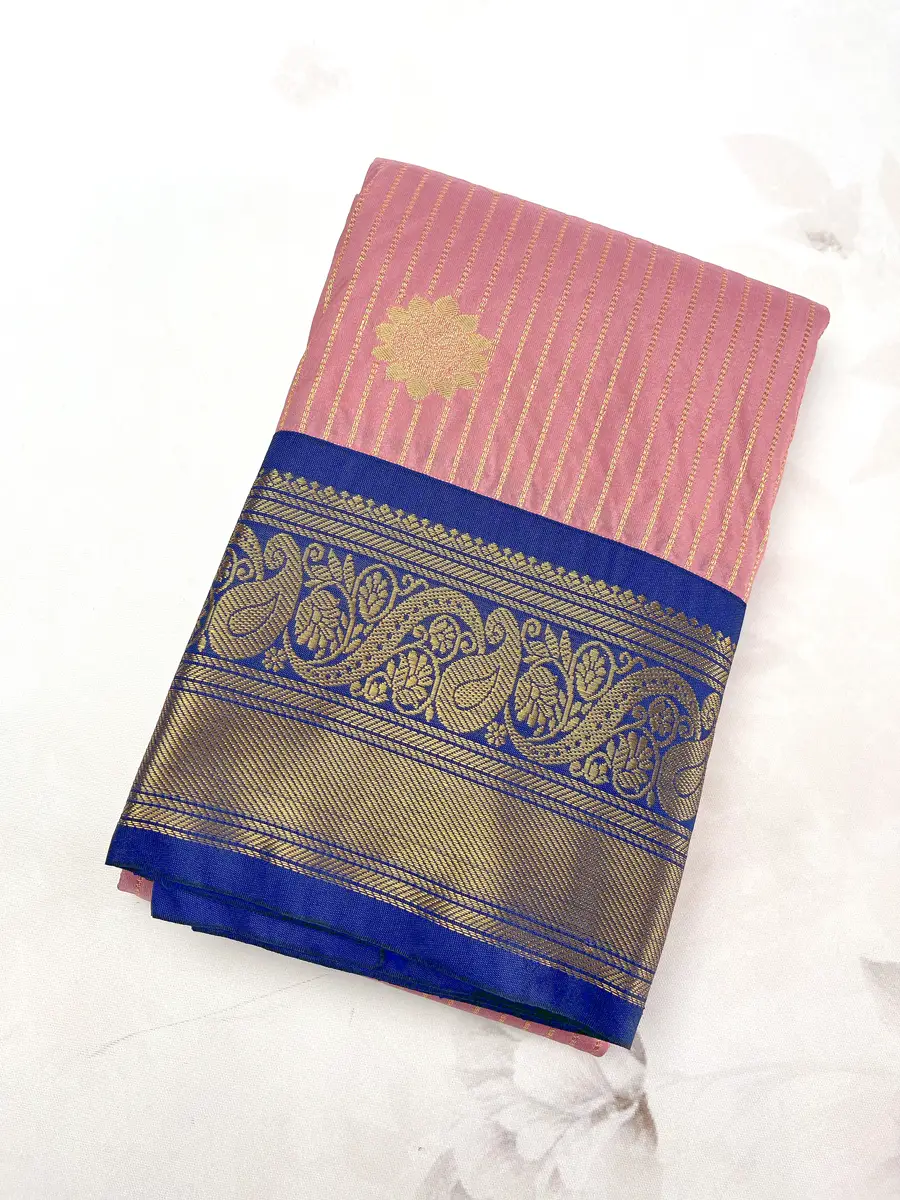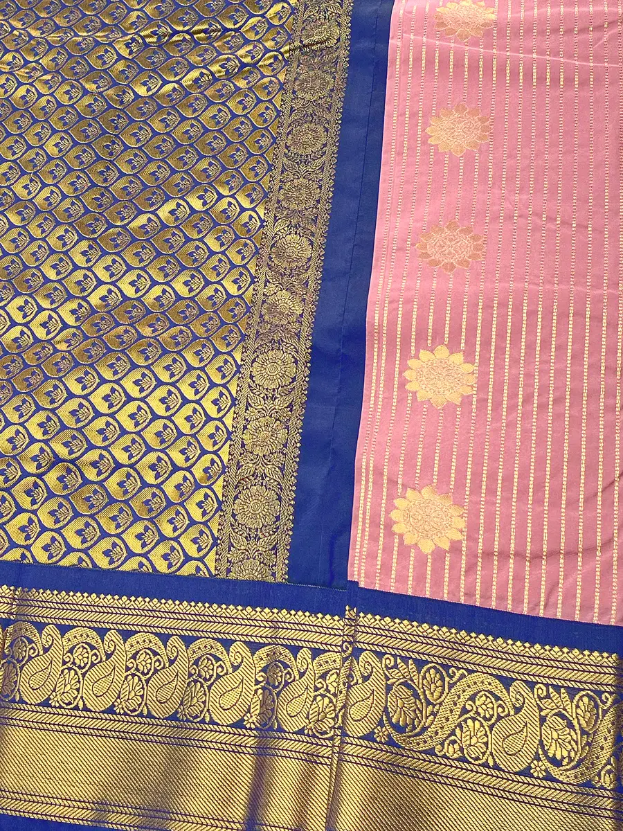 This graceful Luxury Semi Kanchipuram Saree features a soft baby-pink body adorned with delicate gold zari stripes and floral buttas, creating a gentle and elegant aesthetic perfect for festive and traditional occasions.