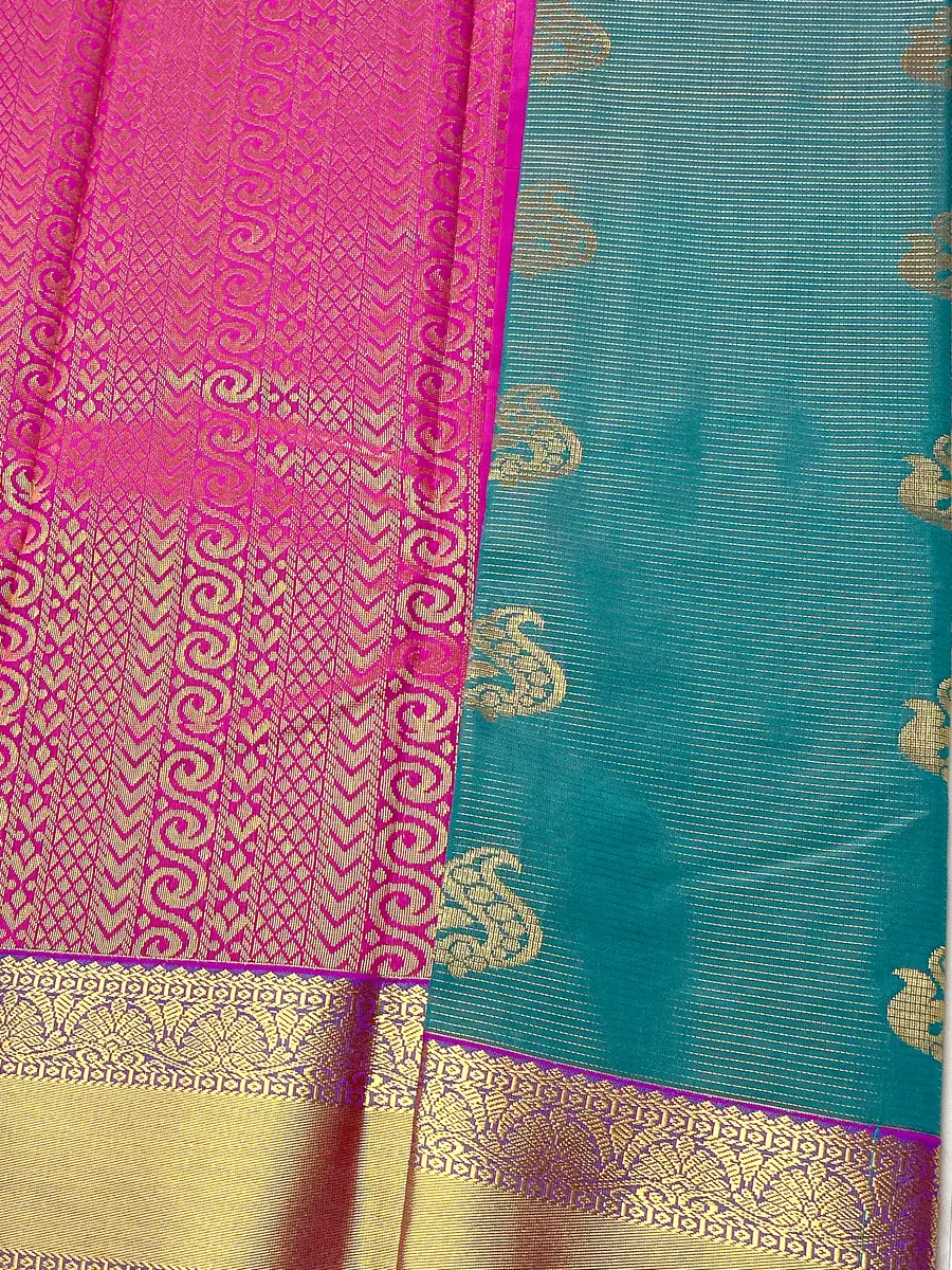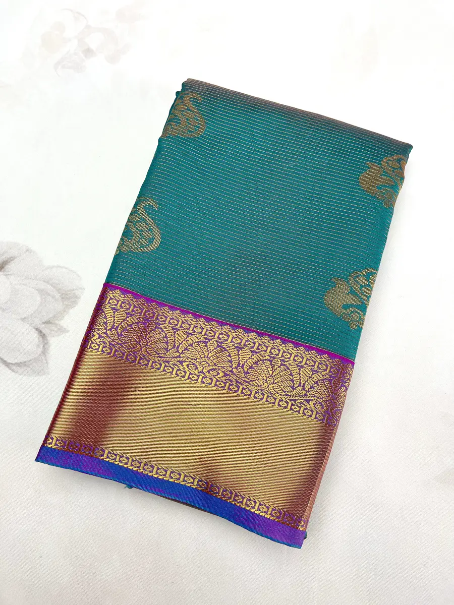 This striking Luxury Semi Kanchipuram Saree now features a refreshing teal-blue body, woven with elegant vertical zari lines and rich paisley motifs that radiate sophistication and festive charm. The cool tone brings a graceful contrast and enhances the richness of the zari work.
