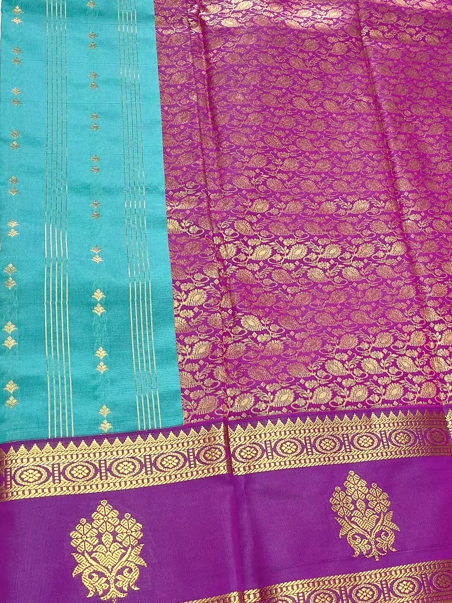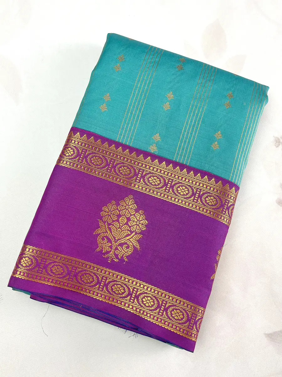 This vibrant Luxury Semi Kanchipuram Saree features a refreshing turquoise-blue body, beautifully adorned with elegant vertical zari stripes and delicate buttas that add a bright, graceful touch. The cool tone brings a fresh festive vibrance, perfect for weddings and celebrations.