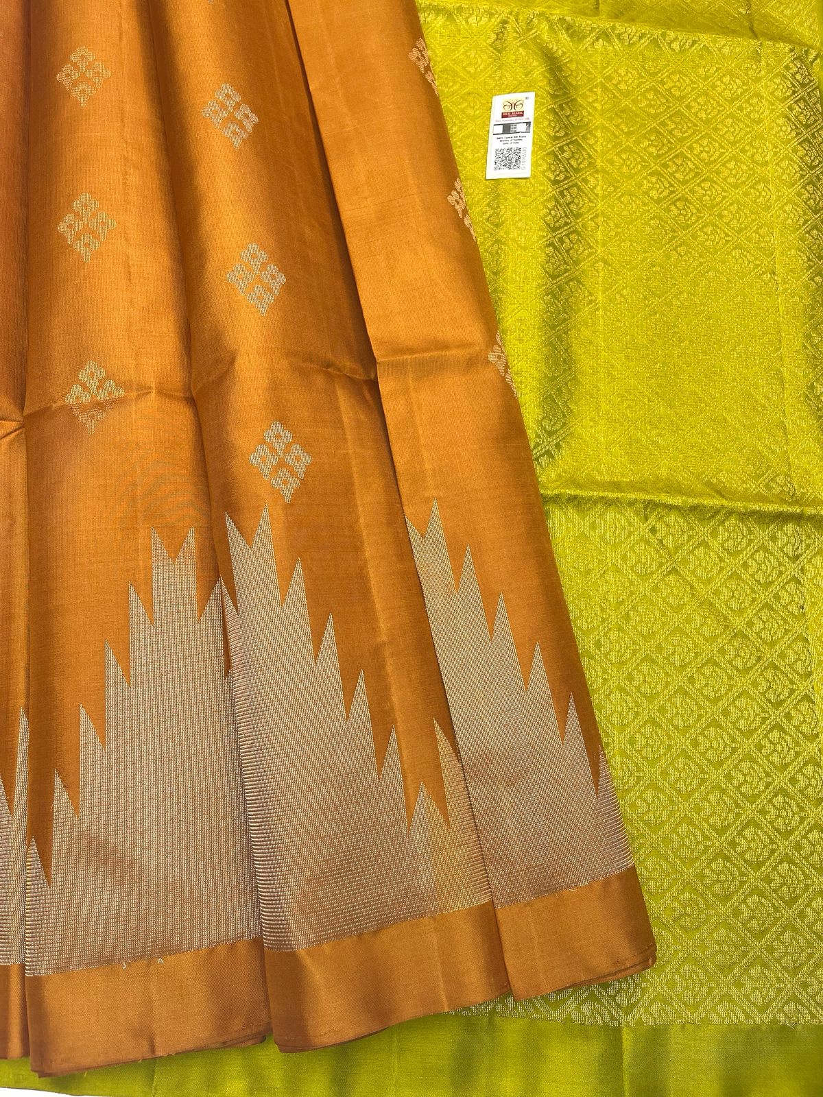 Premium Pure Handloom Soft Silk Saree featuring a stunning burnt orange body adorned with intricate small geometric diamond patterns and cream and beige jagged zigzag border details. The vibrant bright yellow-lime pallu showcases an elegant all-over geometric diamond weave pattern with a stunning Zig Zag Temple Border, creating a perfect balance of warmth and contemporary vibrancy. This Central Government Silk Mark endorsed piece is ideal for functions, ethnic celebrations, and special occasions.