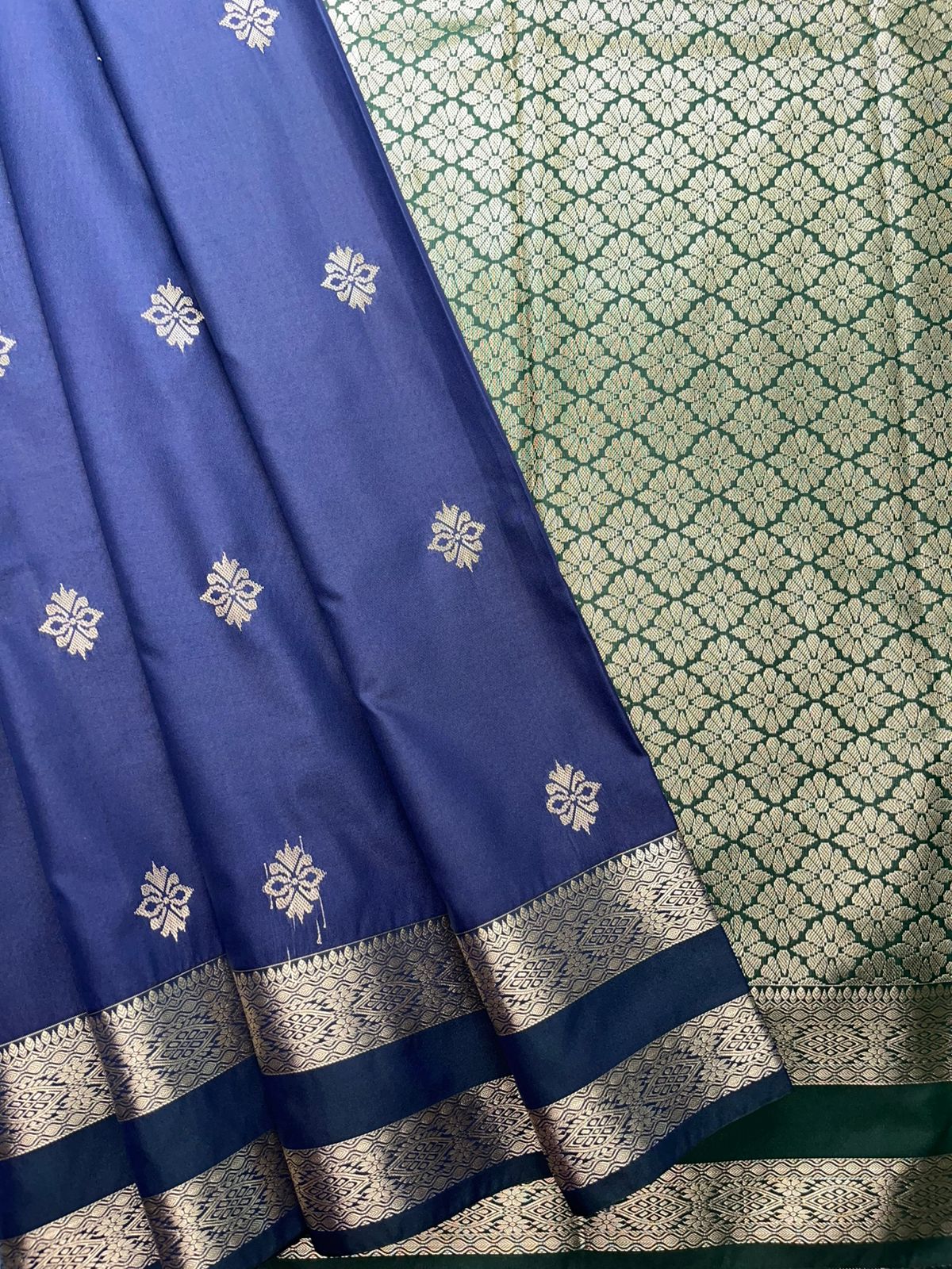 This magnificent Traditional Retta Pettu Border Soft Silk Saree in Navy Blue and Forest Green is a celebration of South Indian textile artistry. The sophisticated Navy Blue body, delicately adorned with scattered silver geometric cross buttas, presents an understated elegance that is perfect for the discerning wearer. The lush Forest Green pallu, richly woven with dense silver-ivory floral honeycomb jaal zari, creates a striking contrast that is both bold and refined. Framed by the iconic Retta Pettu double border featuring gold diamond geometric zari, silver diagonal stripes, and dark navy bands, this saree seamlessly blends heritage craftsmanship with timeless sophistication.