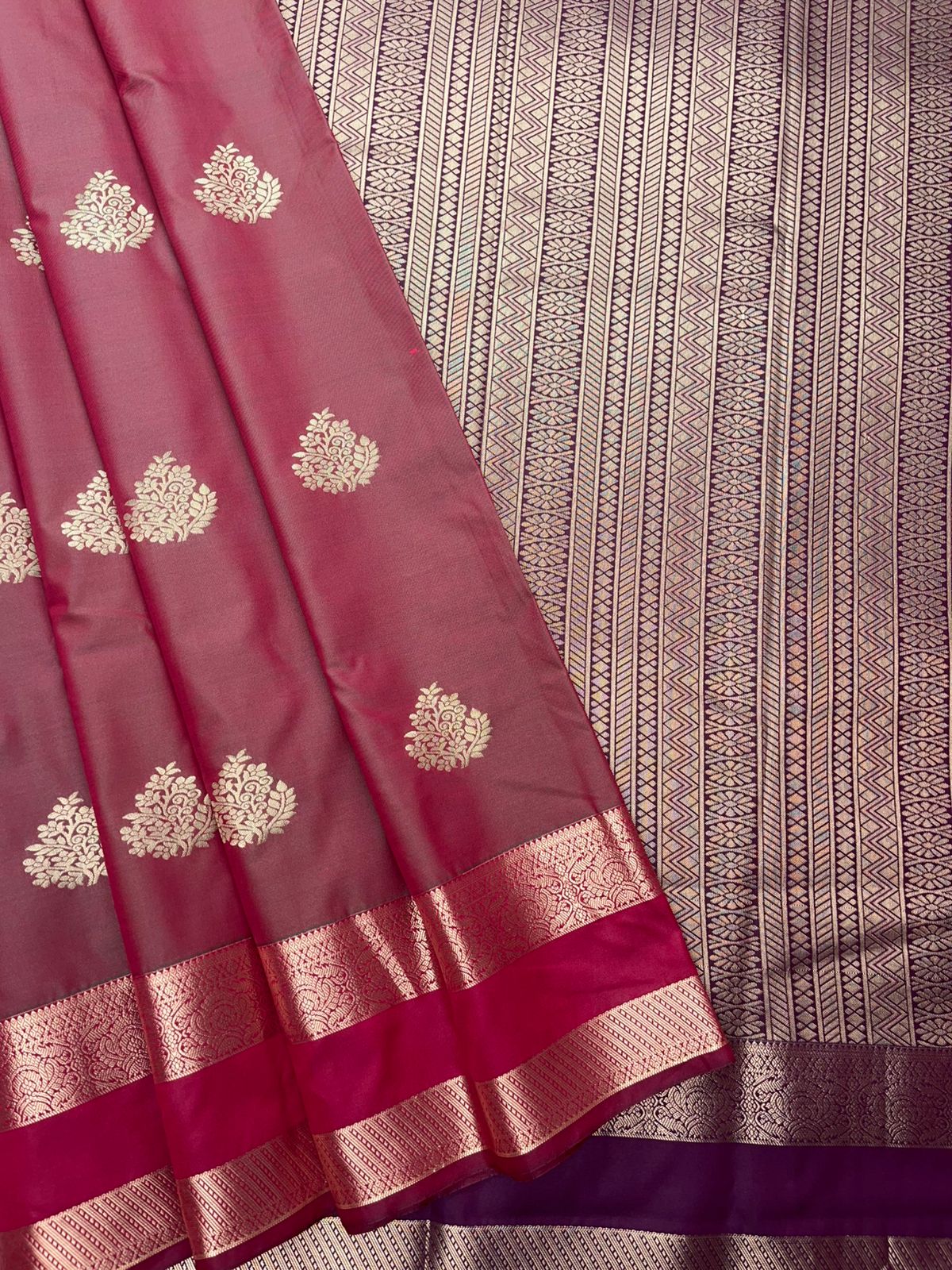 This exquisite Traditional Retta Pettu Border Soft Silk Saree in Rose Pink and Deep Maroon is a testament to timeless elegance and sophisticated craftsmanship. The soft Rose Pink body, adorned with large scattered ivory-cream floral rose and peony buttas, creates a romantic and graceful aesthetic that flatters every complexion. The rich Deep Maroon pallu, intricately woven with dense gold floral peony rose jaal zari of exceptional intricacy, adds a regal and sophisticated dimension that elevates the entire ensemble. Finished with the iconic Retta Pettu double border featuring rose-pink, magenta, and deep maroon bands accented with gold geometric zari work, this saree is the epitome of South Indian bridal elegance.