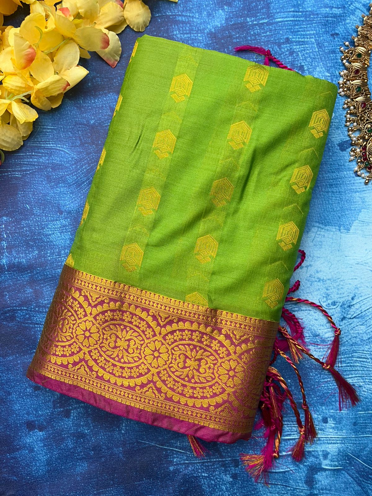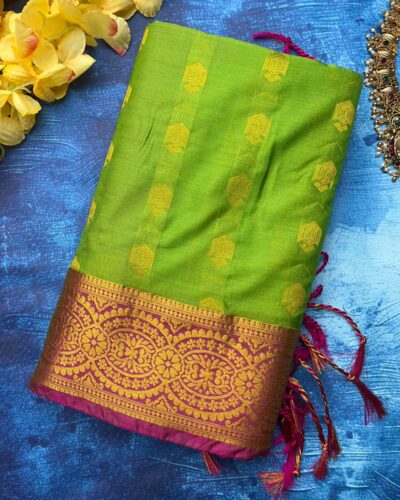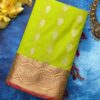 • Body: Bright Lime and Neon Green (#32CD32) with Gold and Yellow Zari Hexagonal Shield-Shaped Buti Motifs